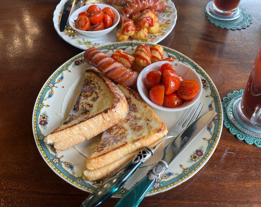 토스트 + 소시지 + 감자튀김 + 토마토 + 아메리카노 구성
